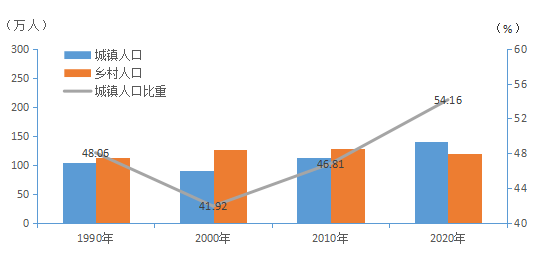 全市常住人口[3]中,居住在城鎮(zhèn)的人口為1409820人,占54.16 %;居住在鄉(xiāng)村的人口為1193139人,占45.84 %。與2010年第六次全國人口普查相比,城鎮(zhèn)人口增加276170人,鄉(xiāng)村人口減少95023人,城鎮(zhèn)人口比重提高7.35個(gè)百分點(diǎn)。