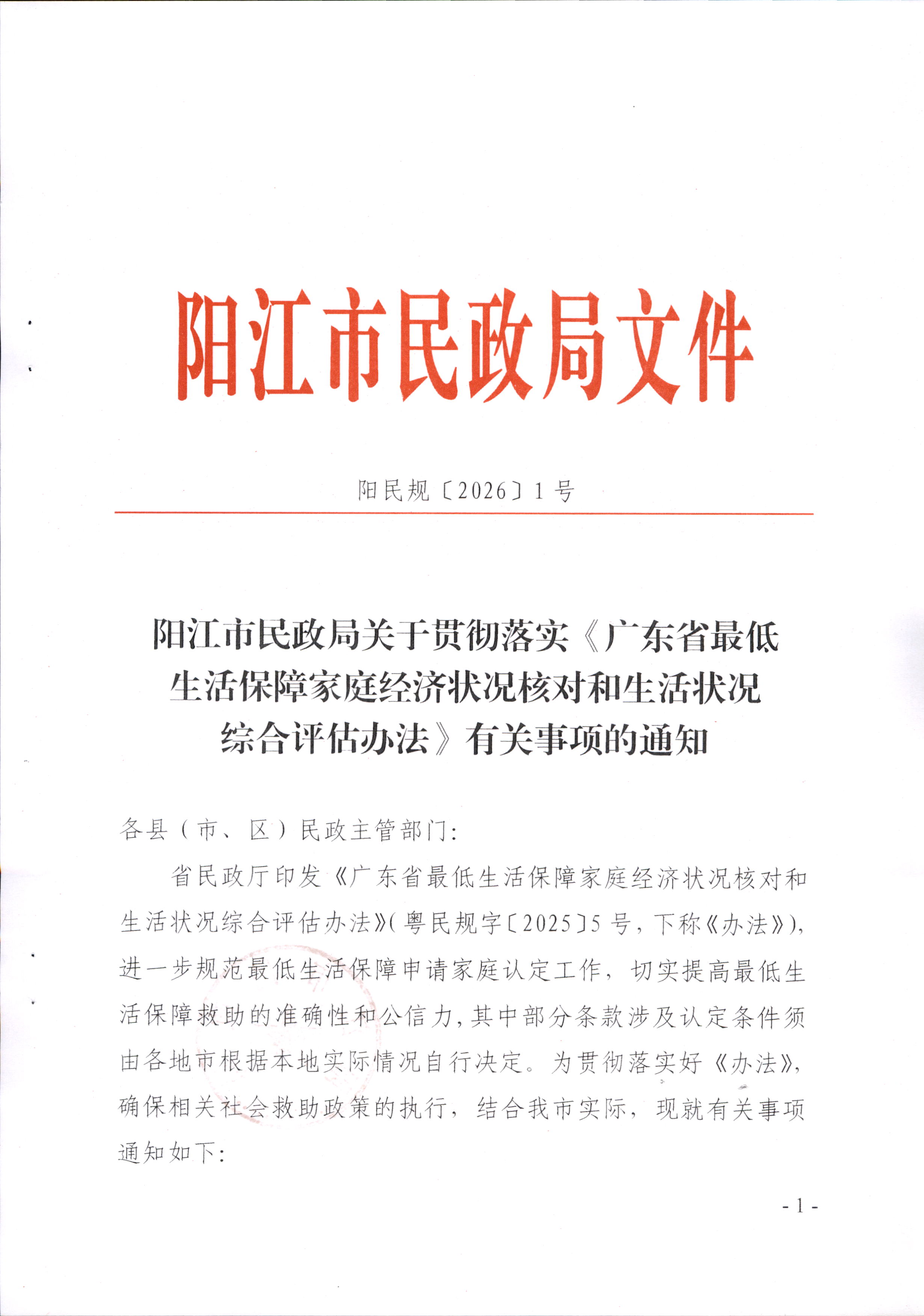 陽江市民政局關(guān)于貫徹落實《廣東省最低生活保障家庭經(jīng)濟狀況核對和生活狀況綜合評估辦法》有關(guān)事項的通知