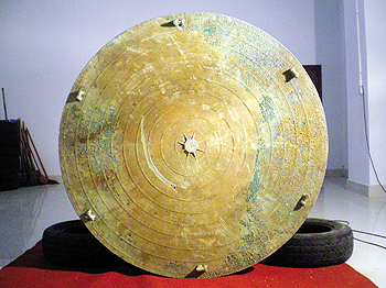 銅鼓面直徑142厘米,高82厘米,束腰狀,無封底,鼓面鑄同心圓條紋,中心是一個(gè)八角星,周邊平均分布著六個(gè)蛙狀突起物,鼓腰中部對稱分布兩對鼓環(huán),整個(gè)器物全為銅質(zhì)。銅鼓基本完整,叩時(shí)發(fā)出洪亮的金屬聲響。經(jīng)省文物考古所多位專家初步考證,認(rèn)為該銅鼓是全省目前所發(fā)現(xiàn)的體積最大的銅鼓,其高度為全國第一,鼓面面積為全國第二,體積居世界第三。專家認(rèn)為該銅鼓是中國古代西南地區(qū)少數(shù)民族使用的重要器物。