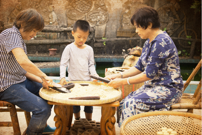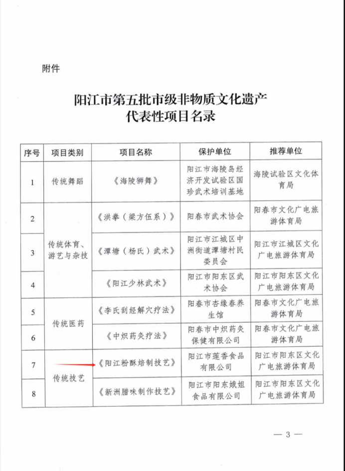 陽江粉酥焙制技藝是一項以炒米粉為主要材料,通過烘焙制作而成的一項傳統(tǒng)餅類食品制作技藝。由陽江人民在生活和習俗中產(chǎn)生、傳承和發(fā)展。陽江粉酥焙制技藝有選料、炒米、磨粉、配料拌合、上印制作、烘焙、起焙裝缸工序。