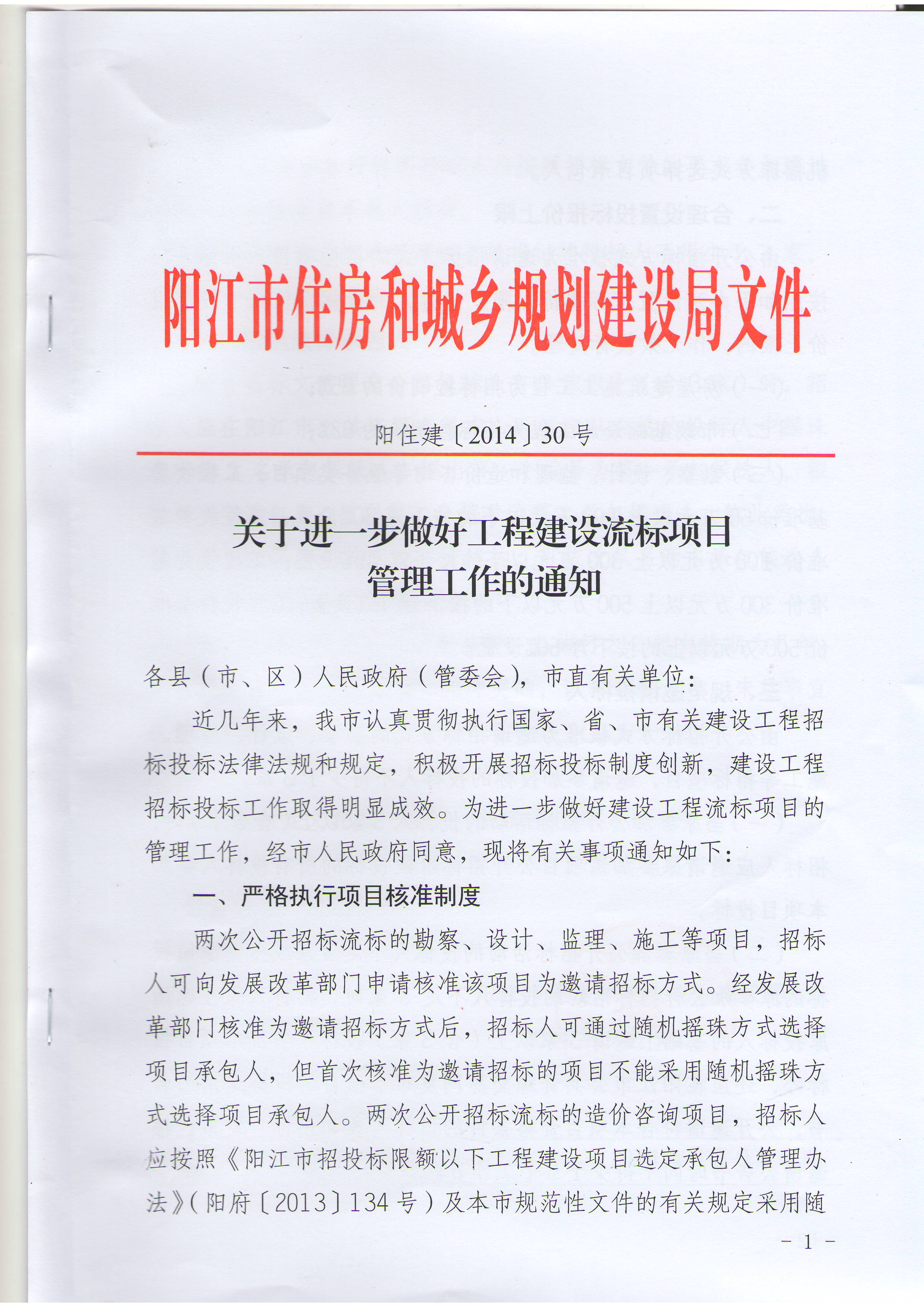 關(guān)于進(jìn)一步做好工程建設(shè)流標(biāo)項(xiàng)目管理工作的通知(陽住建【2014】30號(hào))