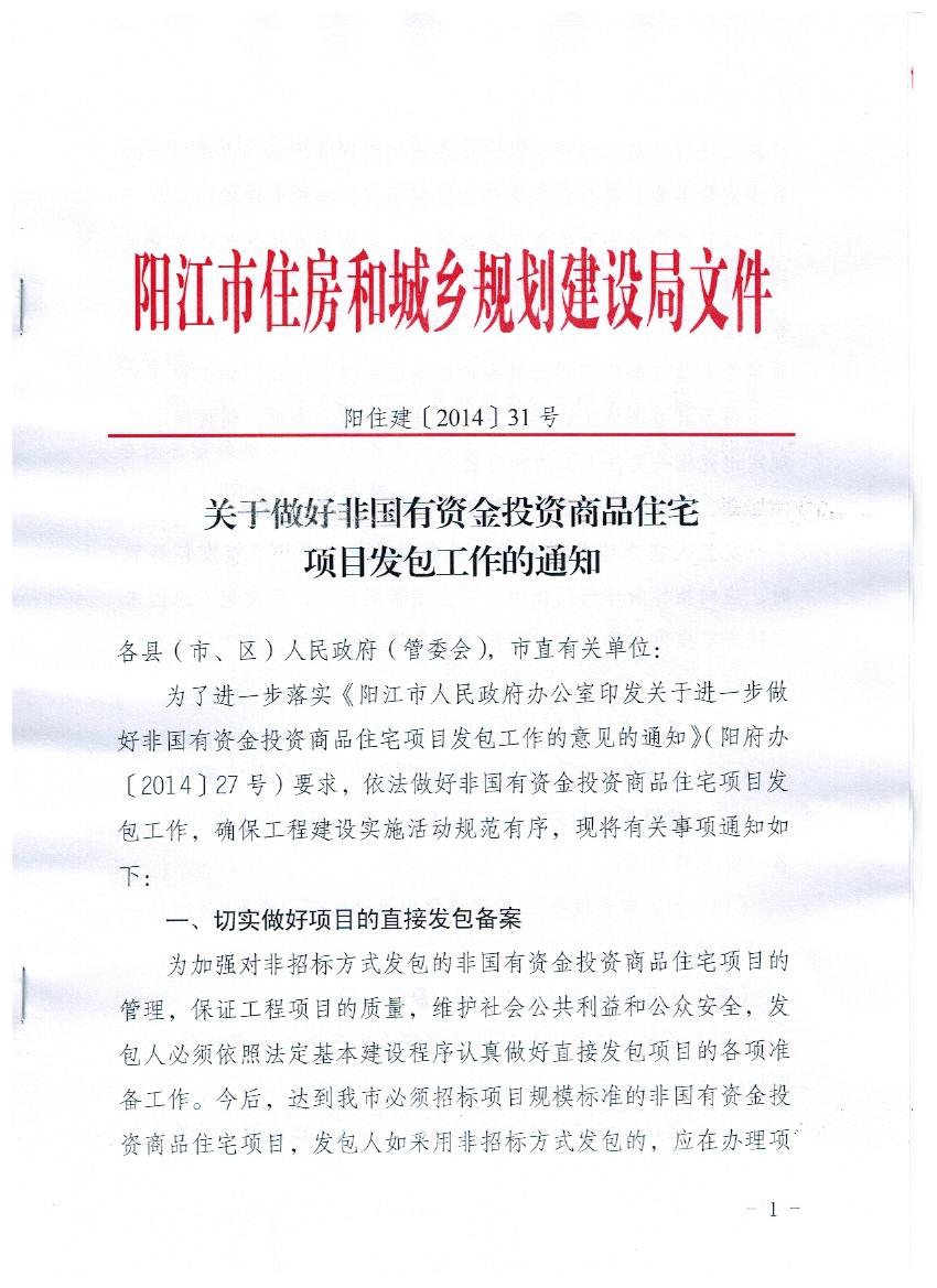 關(guān)于做好非國有資金投資商品住宅項(xiàng)目發(fā)包工作的通知(陽住建【2014】31號(hào))