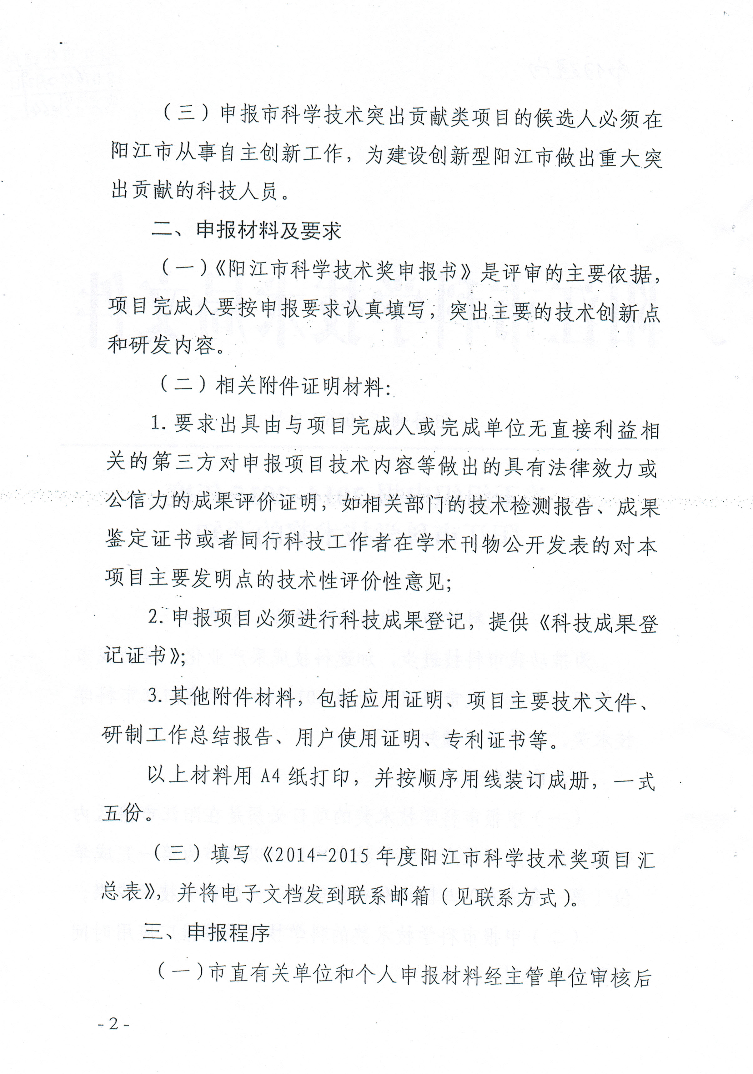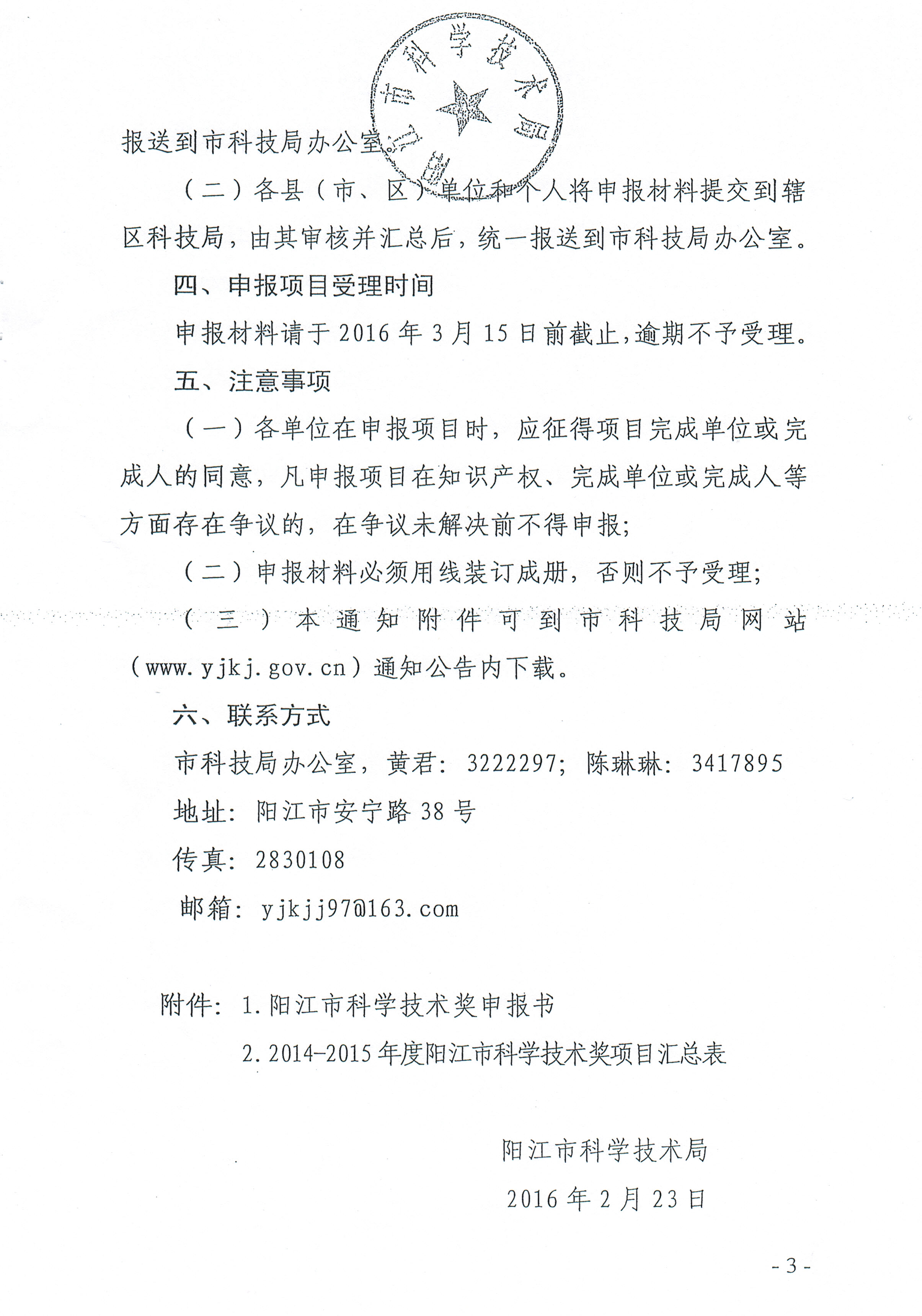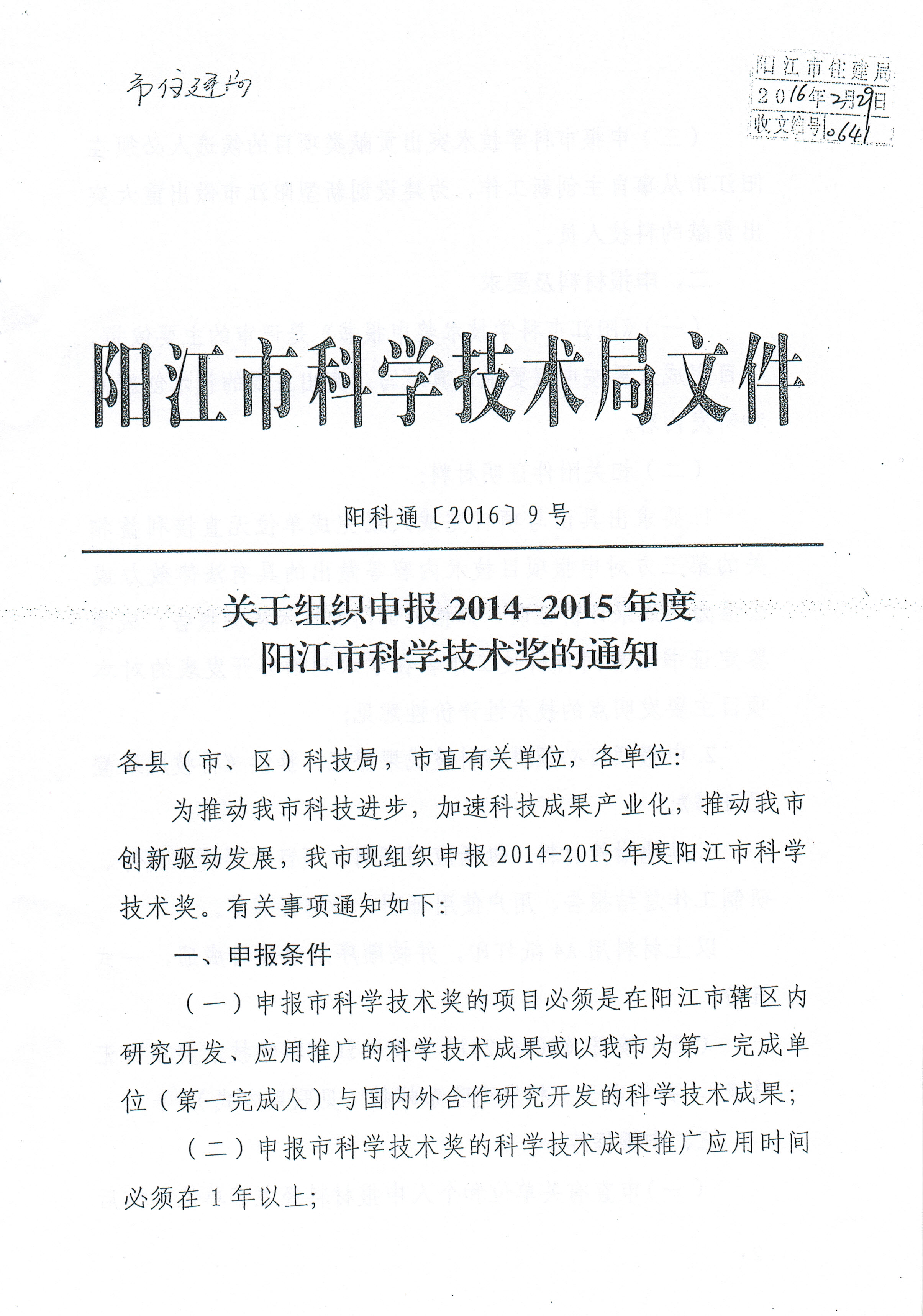 根據(jù)市科技局《關(guān)于組織申報2014-2015年度陽江市科學技術(shù)獎的通知》(陽科通〔2016〕9號)要求,請符合申報條件的有關(guān)單位按要求組織申報材料,于3月10日前將報送我局科技教育科。