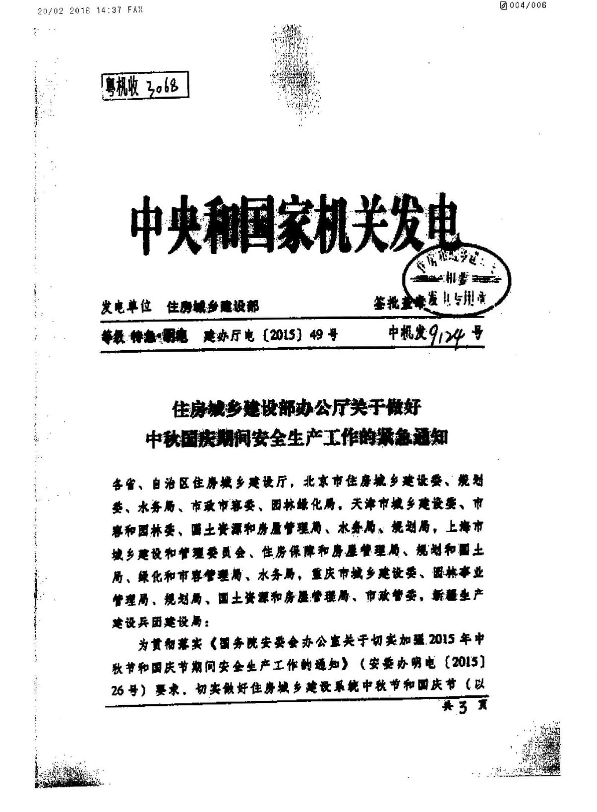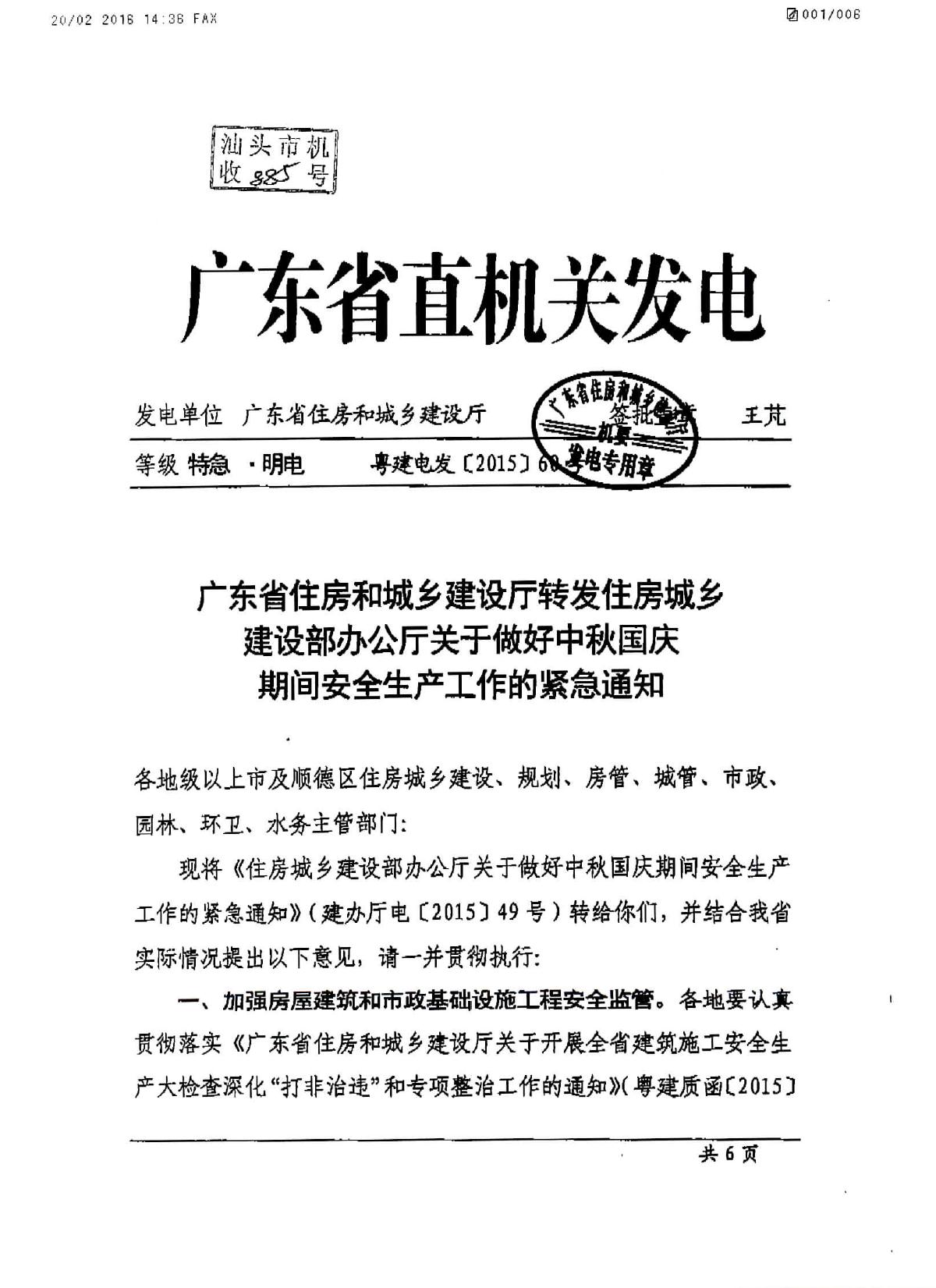 現(xiàn)將《廣東省住房和城鄉(xiāng)建設(shè)廳轉(zhuǎn)發(fā)住房城鄉(xiāng)建設(shè)部辦公廳關(guān)于做好中秋國慶期間安全生產(chǎn)工作的緊急通知》(粵建電發(fā)﹝2015﹞60號)轉(zhuǎn)發(fā)給你們,請遵照執(zhí)行。