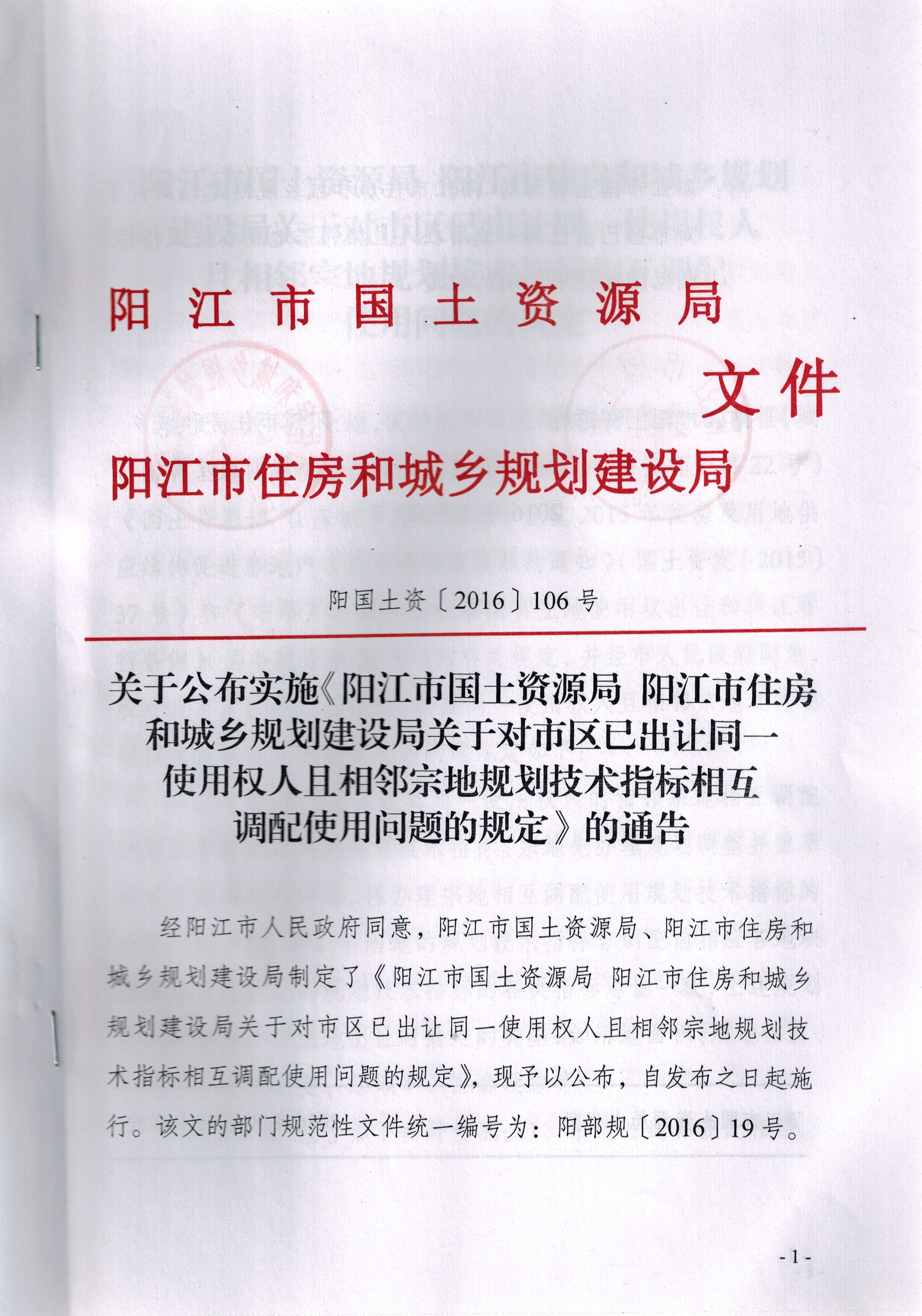 關(guān)于公布實施《陽江市國土資源局 陽江市住房和城鄉(xiāng)規(guī)劃建設(shè)局關(guān)于對市區(qū)已出讓同一使用權(quán)人且相鄰宗地規(guī)劃技術(shù)指標(biāo)相互調(diào)配使用問題的規(guī)定》的通告